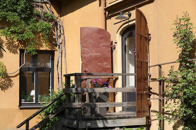Det har pilasterindelning, betonat mittparti med en barockformad fronton i takvåningen och en valvbåge över balkongdörrarna. Fasaden som tidigare var helt mörkgrå, möjligen för att imitera stenhus, har idag grå linser mot gulbrun putsvägg. Stadsarkitekten anmärkte vid sitt godkännande av ritningarna på det höga taket men godtog det. ”då det ju hör till stilen”. Ett burspråk pryder fasaden mot Orangerigatan.