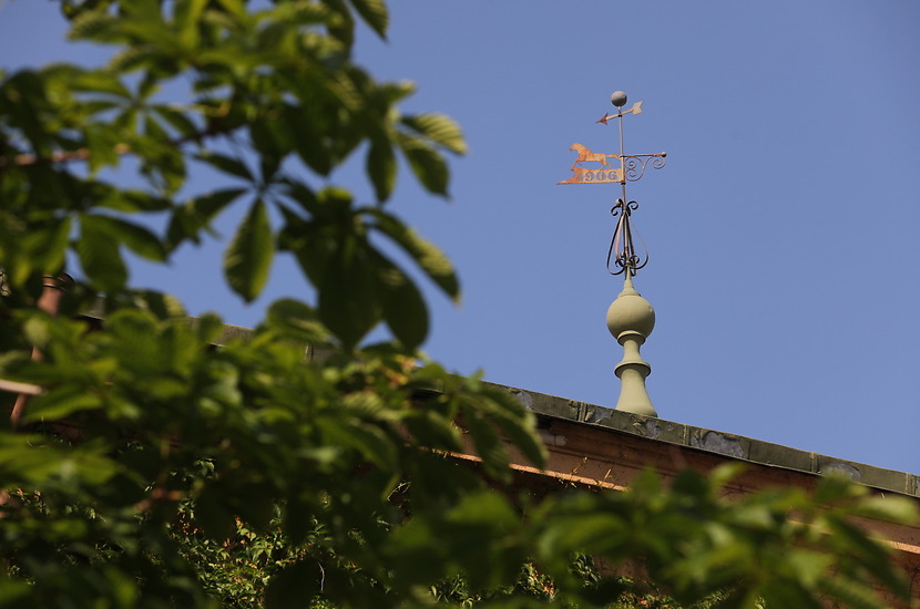 Våningen har flera öppna spisar, breda dörröppningar med kolonner eller skjutdörrar. Matsalen och ”fruns rum är boaserade. En ursprunglig skåpsvägg har bibehållits vid kökets modernisering. Huset är mycket väl bevarat.